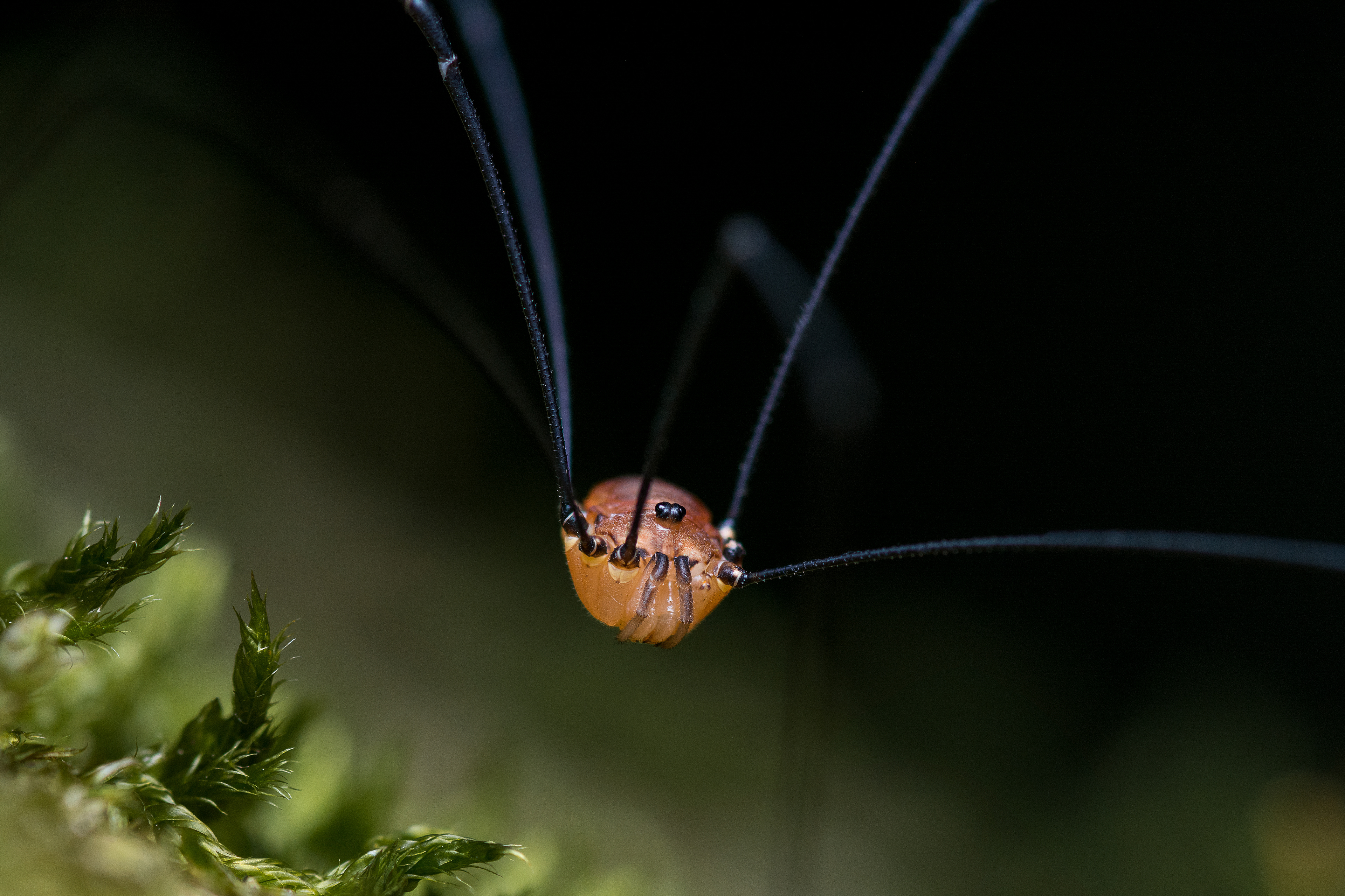 This is a harvestman, a unique arachnid often mistaken for a spider. However with fused body regions and a single pair of eyes, they stand apart from true spiders. Known colloquially as "daddy longlegs" or "shepherd spiders," they're fascinating subjects for photography. Spotting them in the evening, when temperatures drop, can make for easier photography, as they're less active.